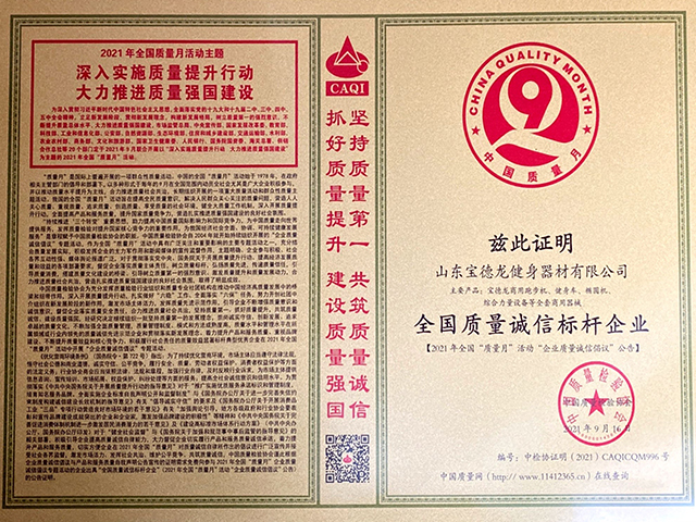 自品牌創立以來,寶德龍始終將質量和服務放在首位,獲得國家、各級政府、行業協會、各類客戶的廣泛認可;連續多年被評為“中國健身器材行業十大知名品牌”、“中國誠信名牌企業”、“全國質量誠信標桿企業”。