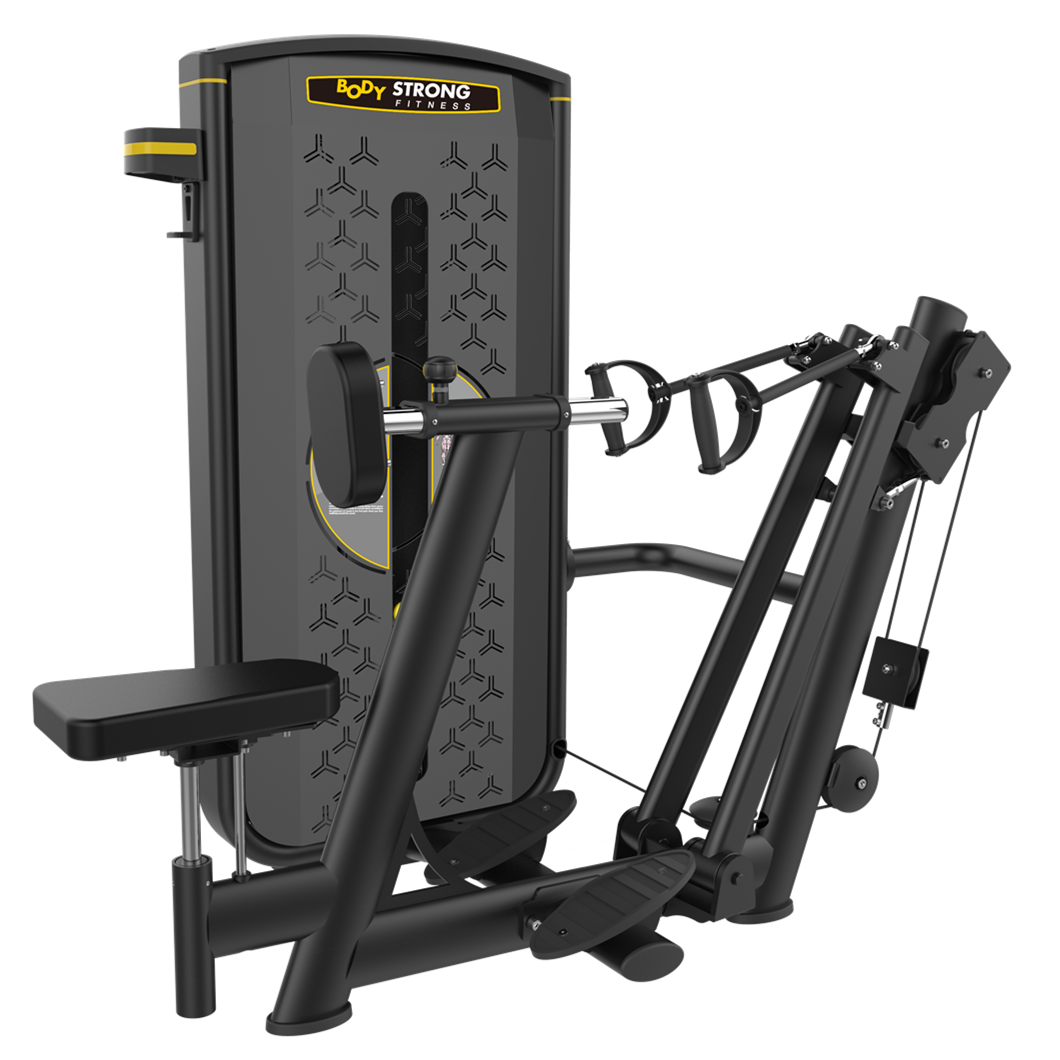 整機將平橢圓管、橢圓管完美結合,采用加厚管材,穩固耐用;搭配高強度鐵護板,并配有安全防護罩,使器械更安全美觀;采用高檔優質鋁滑輪,堅固耐用,運動部分采用雙軌分動式運動設計可以進行單臂運動