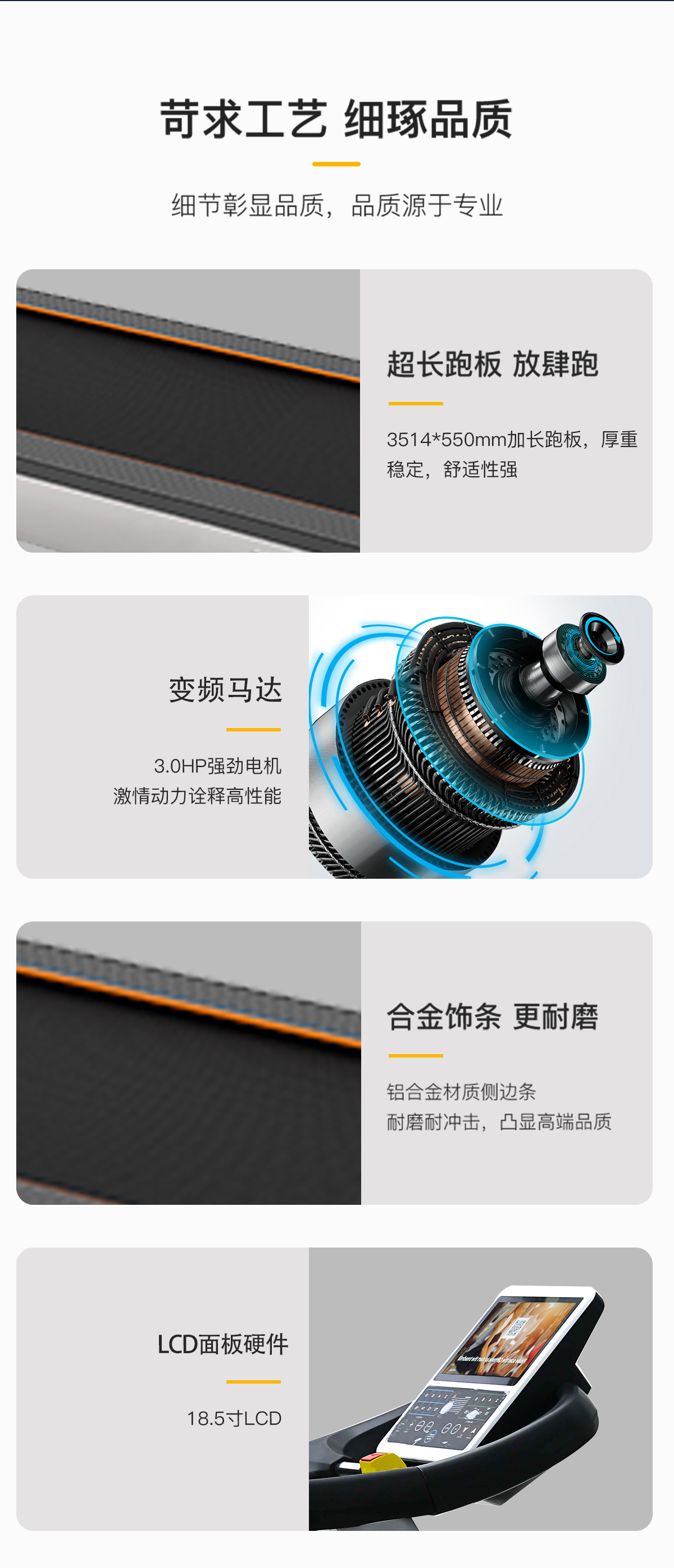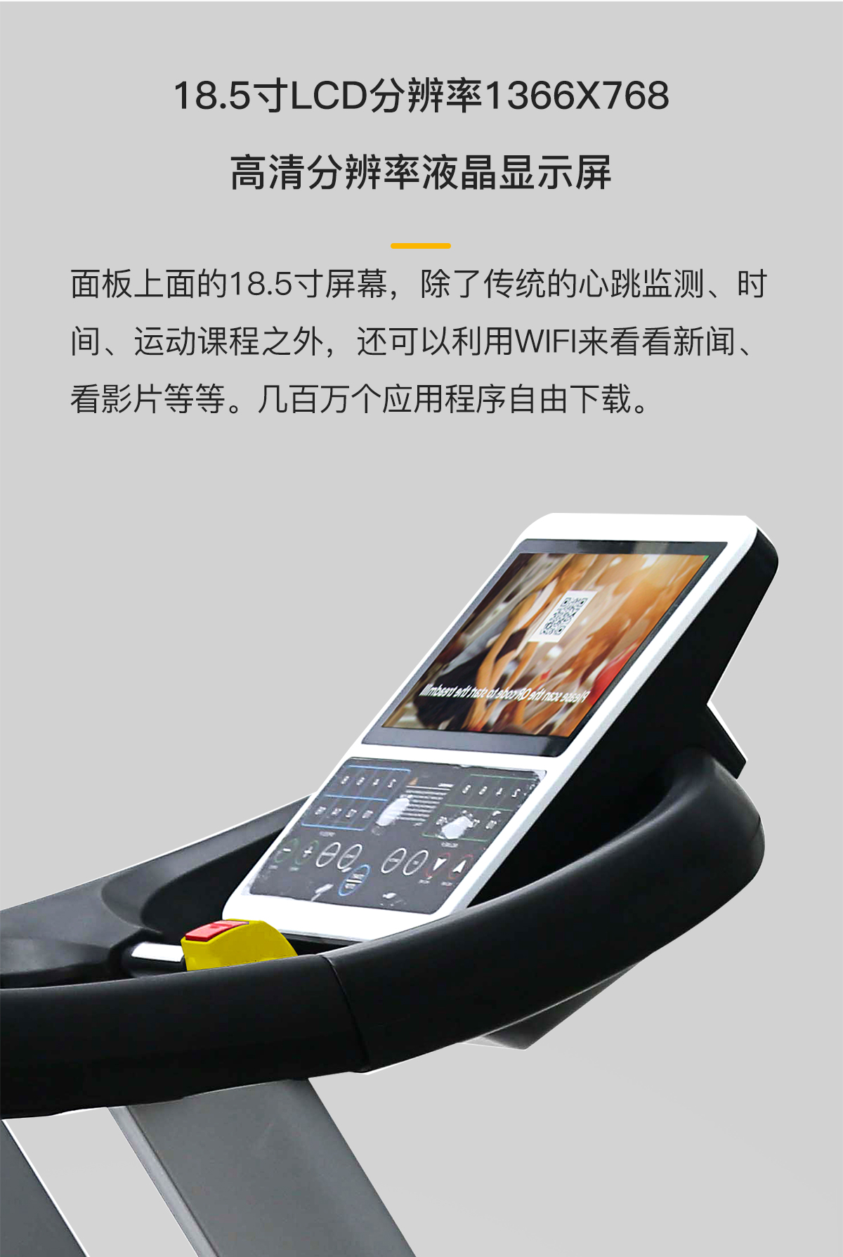 18.5寸LCD高清分辨率液晶顯示屏,智能心率系統,防震彈性跑板,特有的四重避震技術,自潤滑功能,USB:可連接移動外接設備