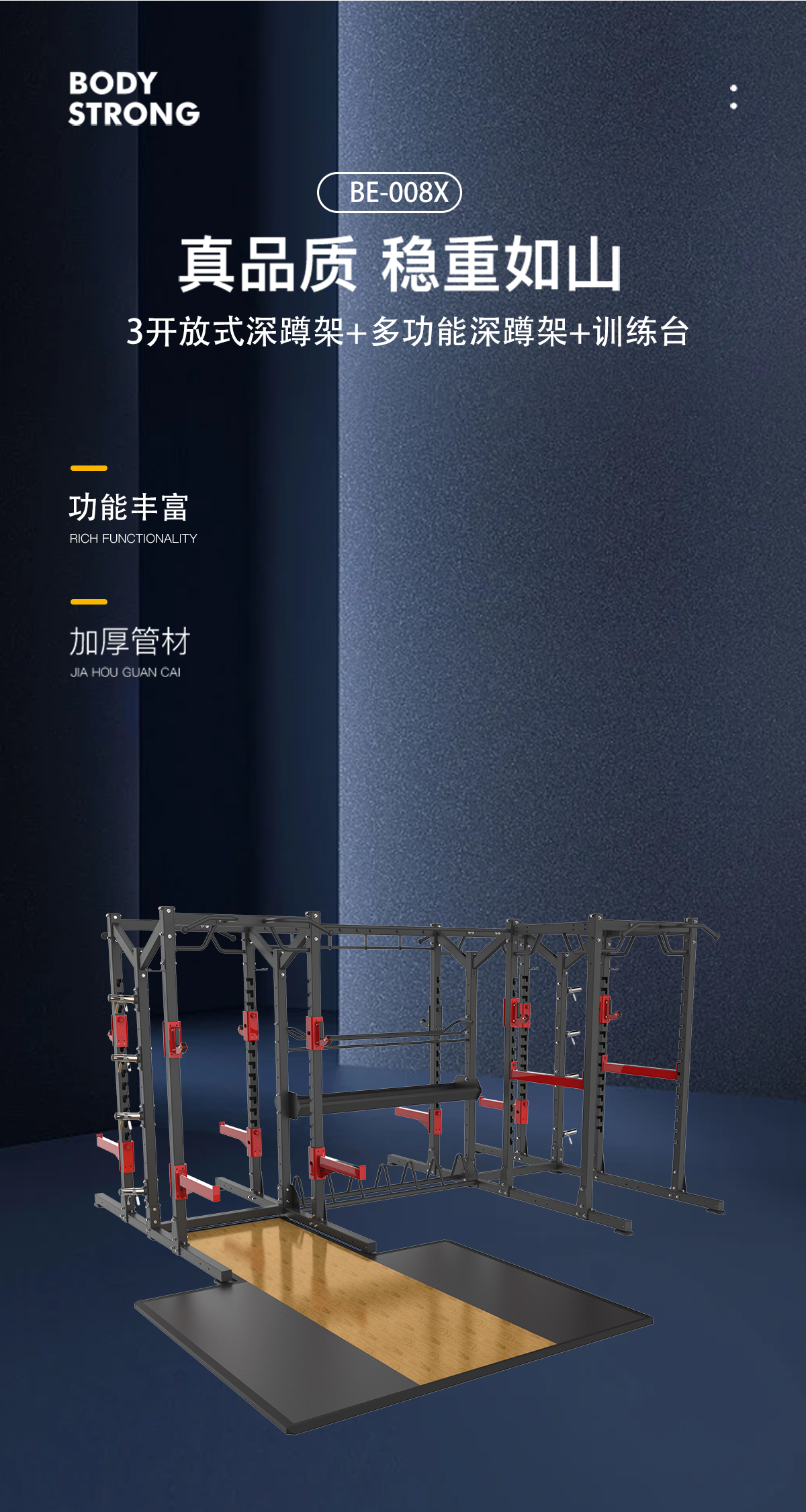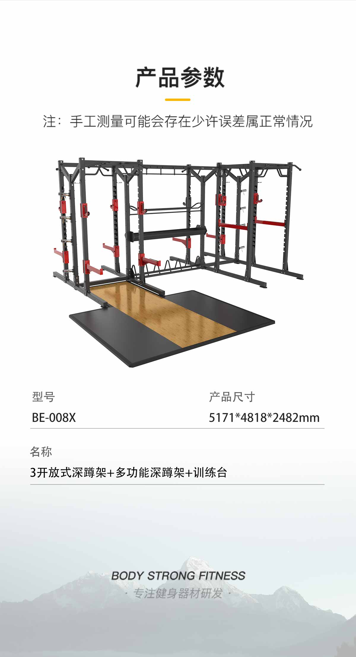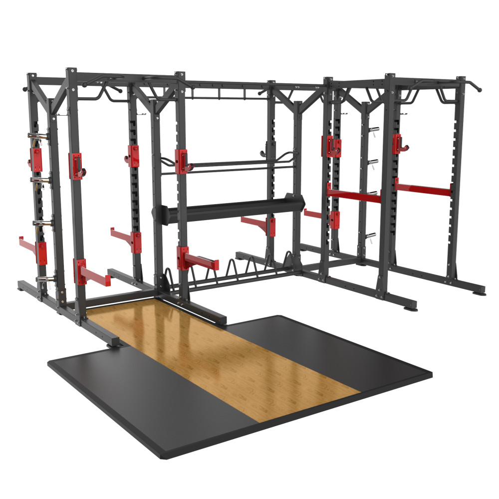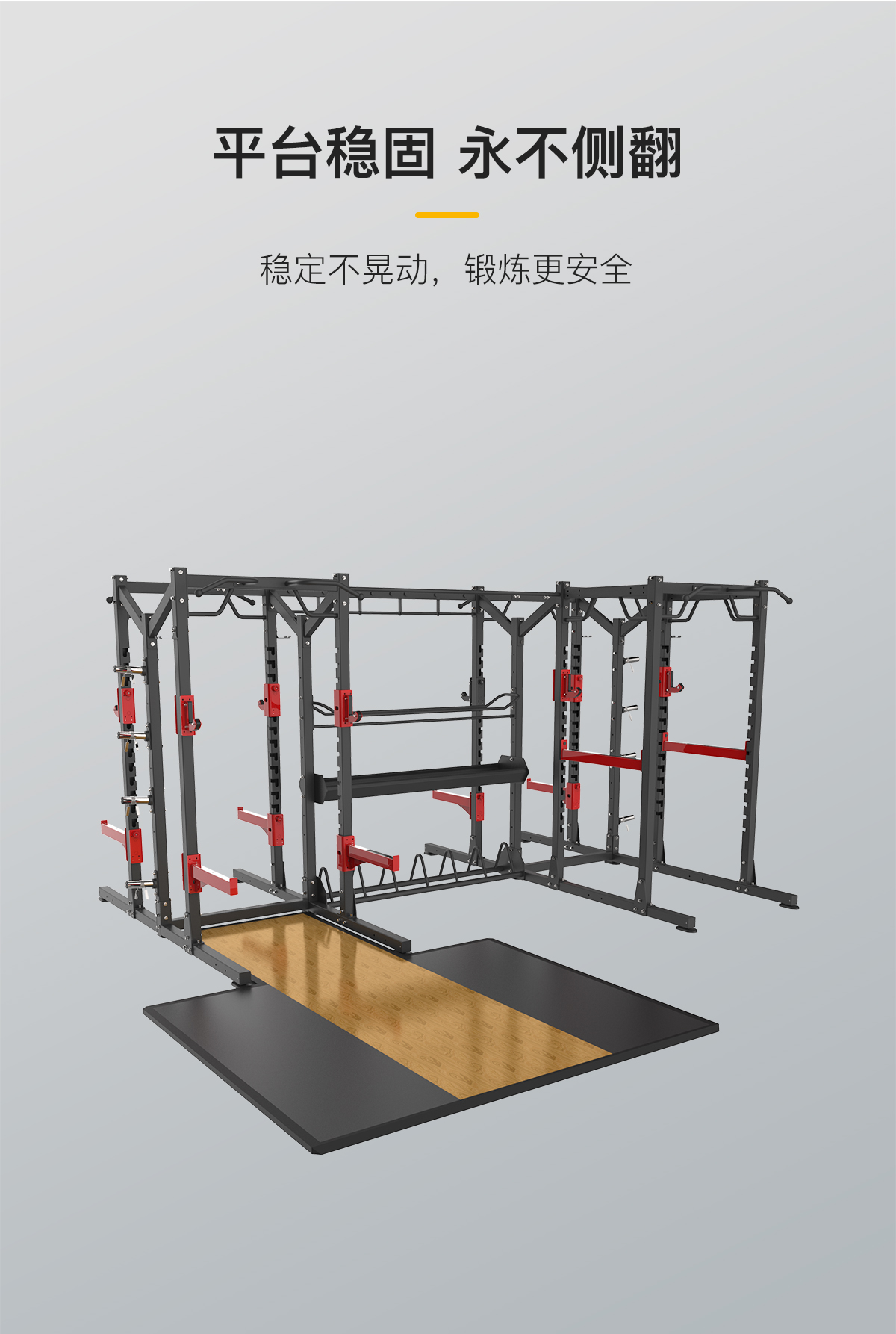 前開放式深蹲架功能模塊+多功能深蹲架功能模塊+組合單排收納模塊+多功能鏈接附件+單杠鏈接附件+杠鈴片儲存鏈接附件+自由儲存鏈接附件+球類儲存鏈接附件+前開放式深蹲訓練臺