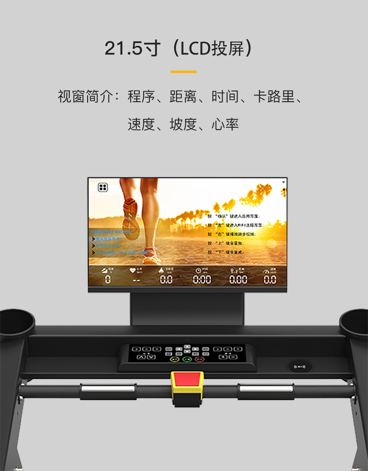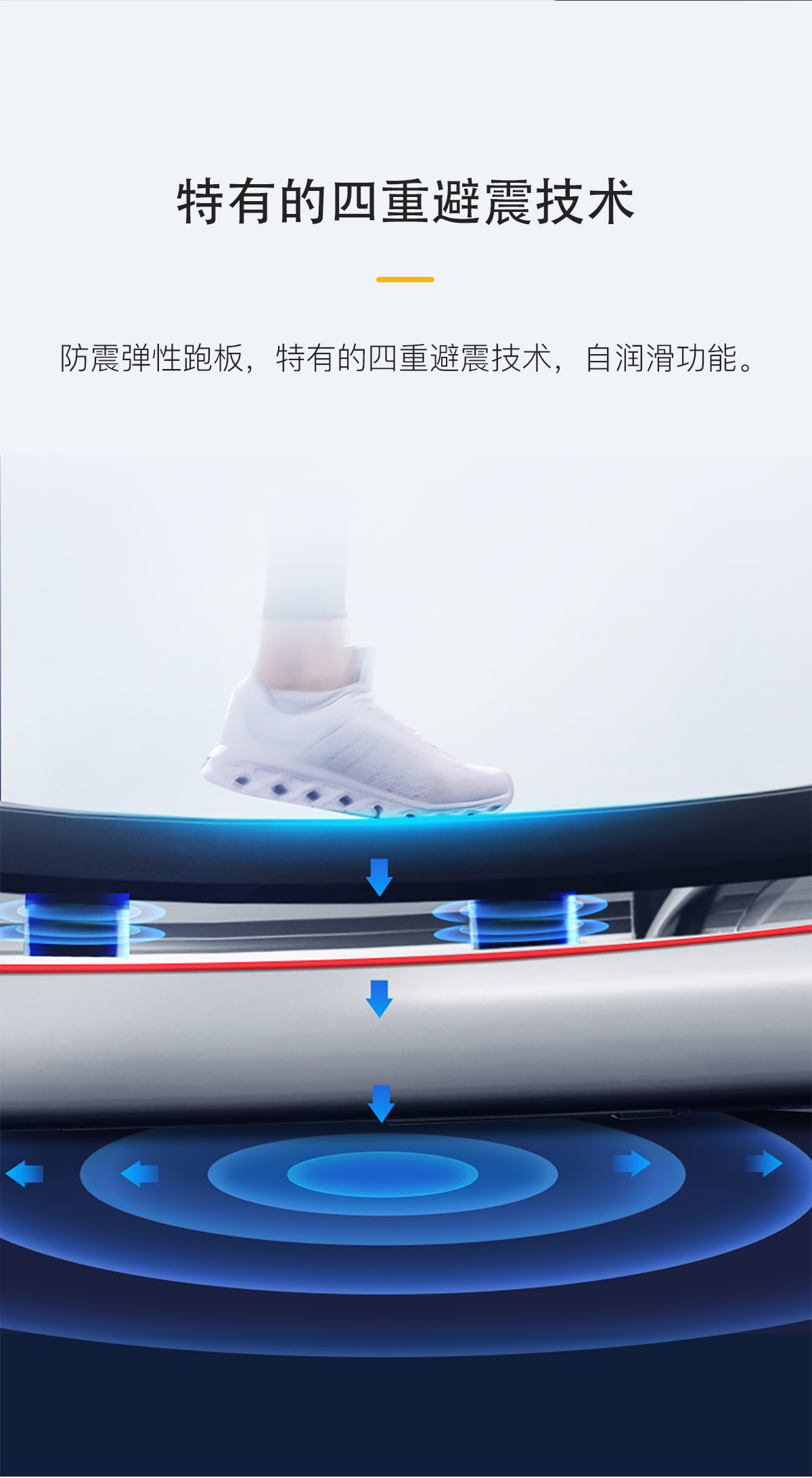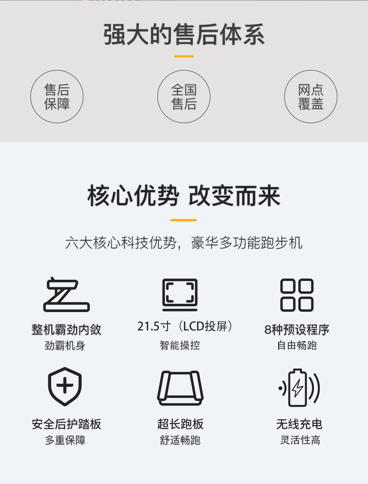 擁有四大產品保險、8種預設程序、超長跑板、無線充電、四重減震技術、自潤滑功能及21.5寸LCD投屏
