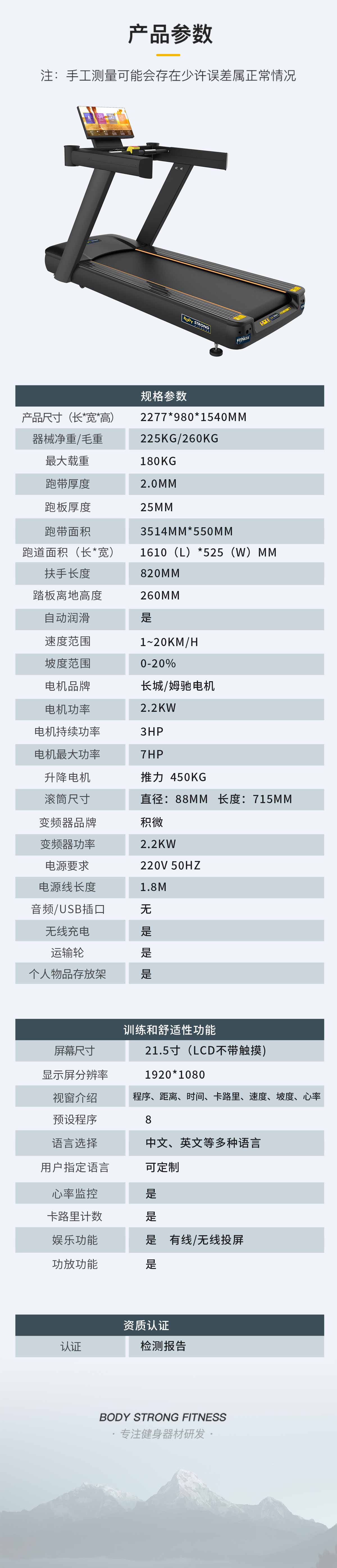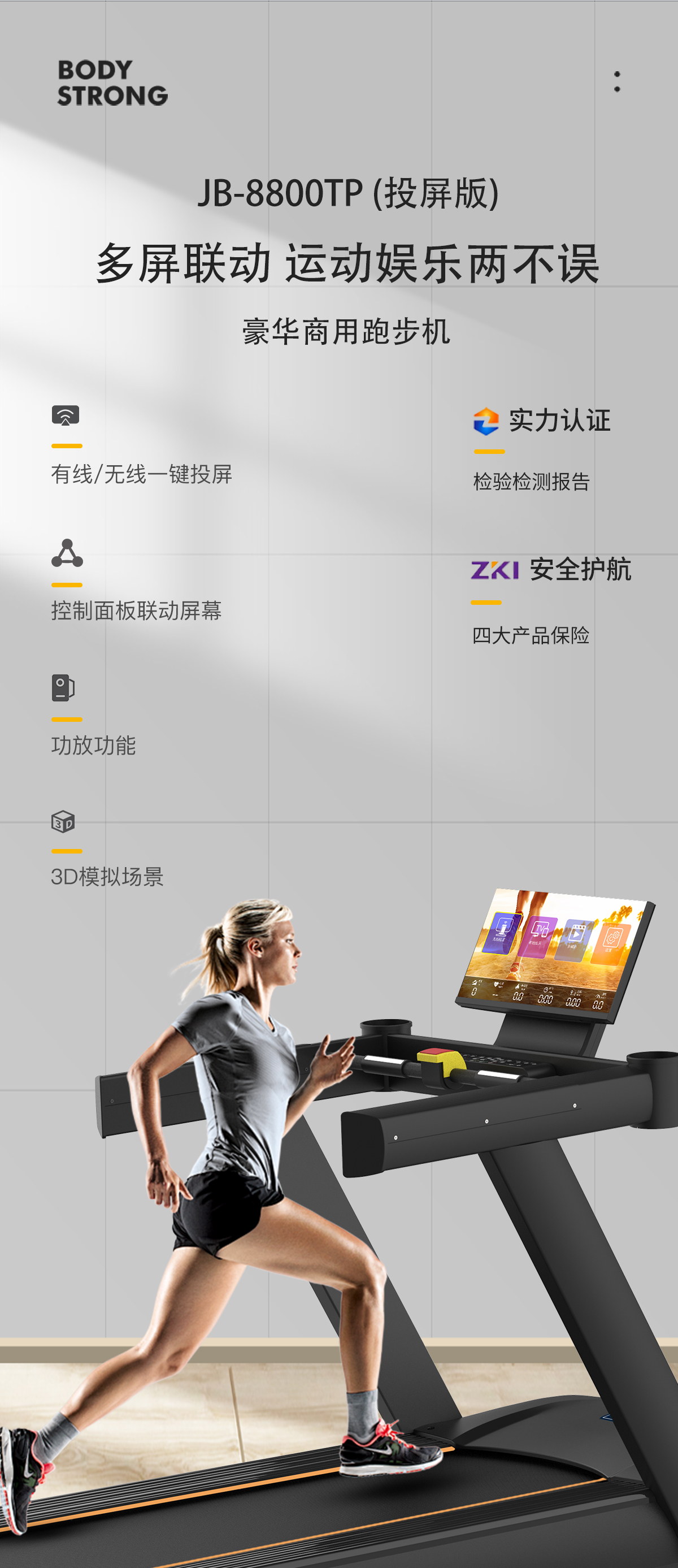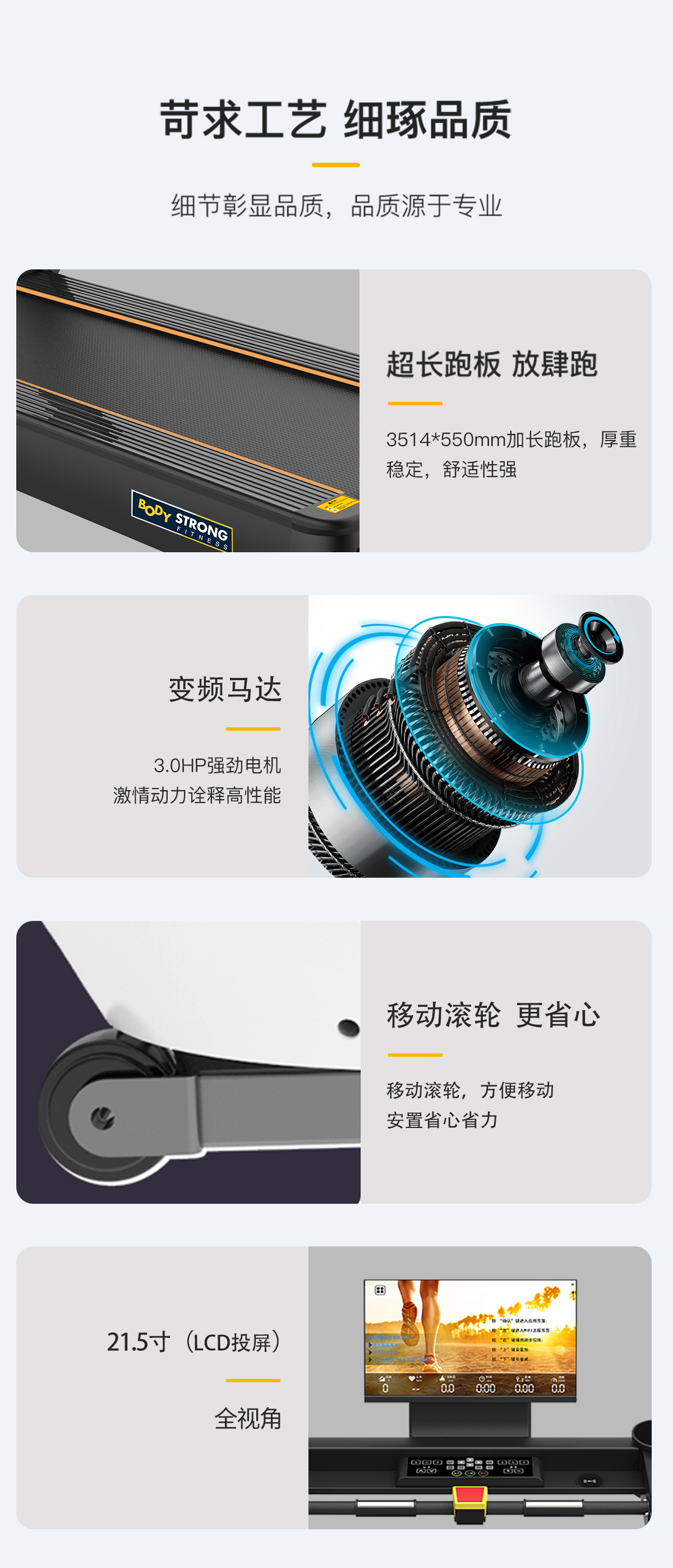 擁有四大產品保險、8種預設程序、超長跑板、無線充電、四重減震技術、自潤滑功能及21.5寸LCD投屏